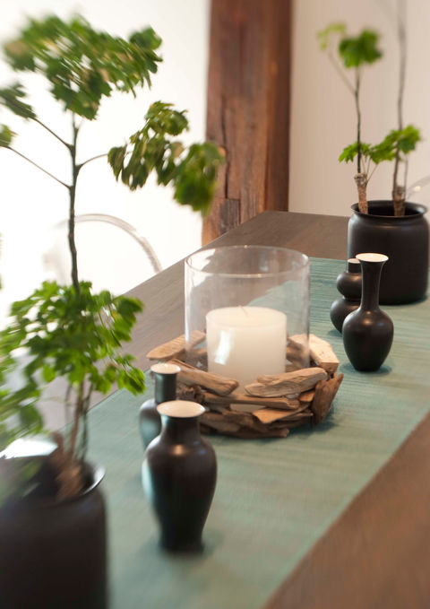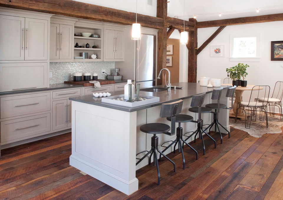 A 150-year-old farmhouse and barn is brought back to life while keeping its rustic antique charm and adding the modern amenities every family wants. In the barn hayloft, the builders salvaged old beams and left them exposed. The original hay moving track and pulley system was re-installed on the central ceiling beam. The pale gray cabinets have a historic charm. Acrylic dining chairs and steel barstools can withstand wet bathing suits, while the steel dining room table, which is on casters, is easily moved about the room.